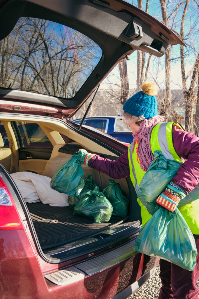 Top Right: A volunteer with Shared Table loads a car for the food bank's delivery program.